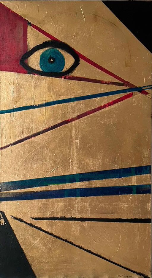 This piece holds so much depth—it’s almost like a fragmented memory captured on canvas. The piercing blue eye, encased in geometric lines, feels like a gaze that transcends time, distance, and even pain. The gold background adds an ethereal quality, as if this vision exists beyond the physical world, in a place of remembrance, longing, or subconscious connection.